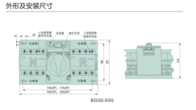 BGQ5-63自動(dòng)轉(zhuǎn)換開關(guān)電器是由小型斷路器(DZ47-63)單機(jī)操作機(jī)構(gòu)、控制回路等組成,所有的元器件安裝在同一塊底板上。自動(dòng)轉(zhuǎn)換開關(guān)電器的控制電源電壓為AC230V、機(jī)械壽命為5000次。